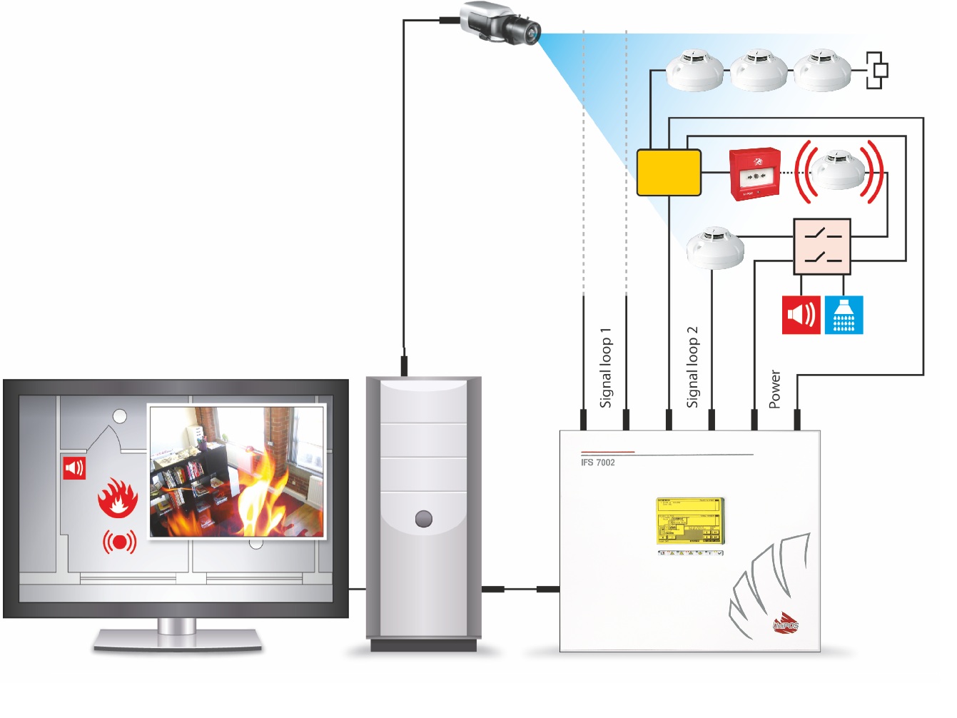 Il sistema di rivelazione incendi analogico interattivo permette inoltre di integrare il semplice sistema di rivelazione con un sistema di sorveglianza con telecamere e di inserire un software grafico su PC per la gestione delle mappe con il posizionamento dei rivelatori e dispositivi antincendio, dal quale è possibile gestire tutto il sistema di rivelazione incendi e il sistema di telecamere.